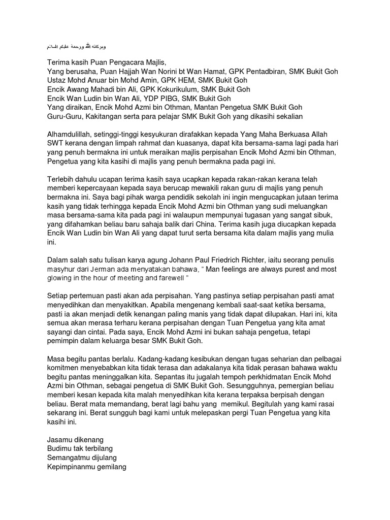 Majlis pelancaran dasar perhutanan malaysia bersempena. Teks ucapan guru besar di mesyuarat agung pibg typo hijabs. Teks ucapan majlis perpisahan.